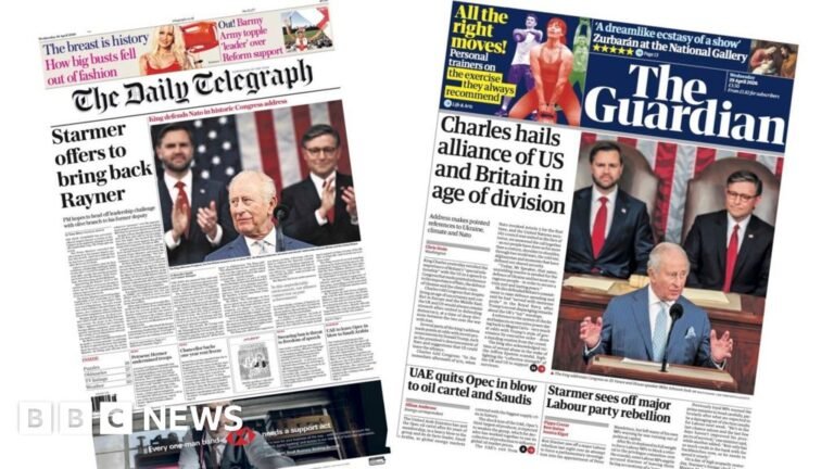 How about a ‘diplomatic masterclass’ in the Daily Mail King’s speech to King’s Congress. Elsewhere, the paper focused on the “sweat revolt” over a vote to have a parliamentary inquiry into Lord Mandelson’s appointment of Sir Keir Starmer as US…